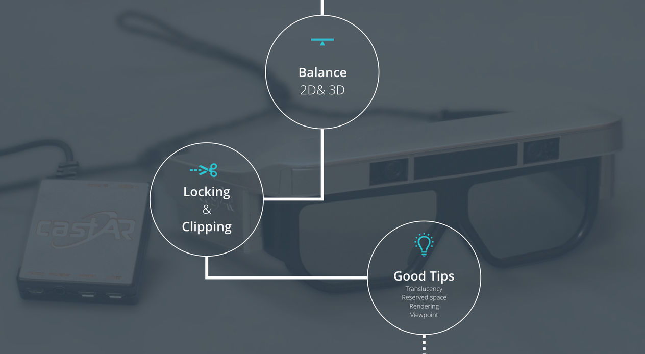 With the takeaways from competitor reviews, attending conferences, and the literature review, I drafted the original design guideline document for our design team as well as the future developers of CastAR. As a console-specific application development documents, these suggestions were super helpful for the team throughout the R&D process at the time because 3D interface & UX design were a brand new topic and there were very few references or guidelines to follow. Most of them are still contributing to later versions of designs after my involvement.
