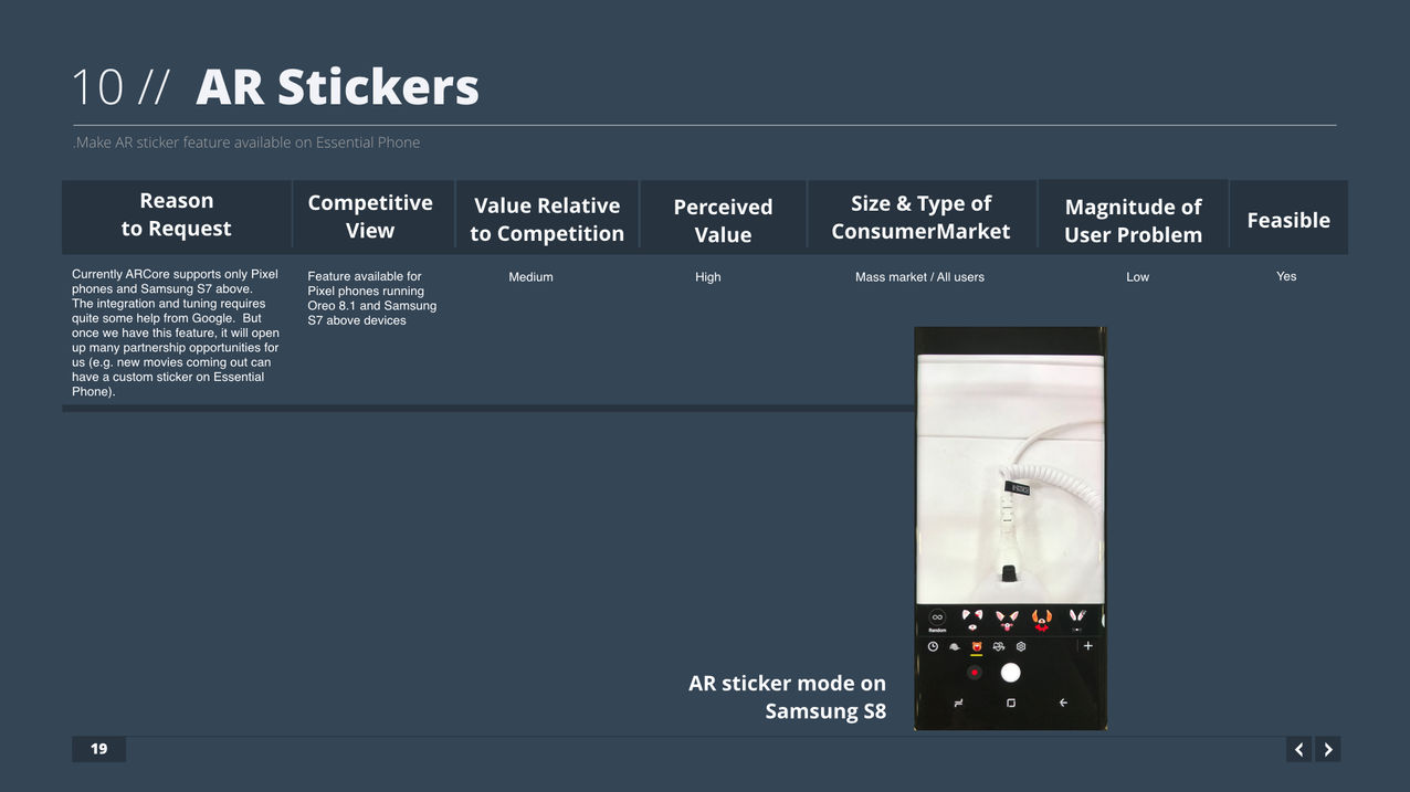 Regarding 10 potential features, we were going to build for the second-generation Essential phone, a few popular phones (at the time) were picked, studied, and compared horizontally. A competitor review was presented to the team which has been super helpful throughout the design process. The following slides come from a portion of the research work I did.