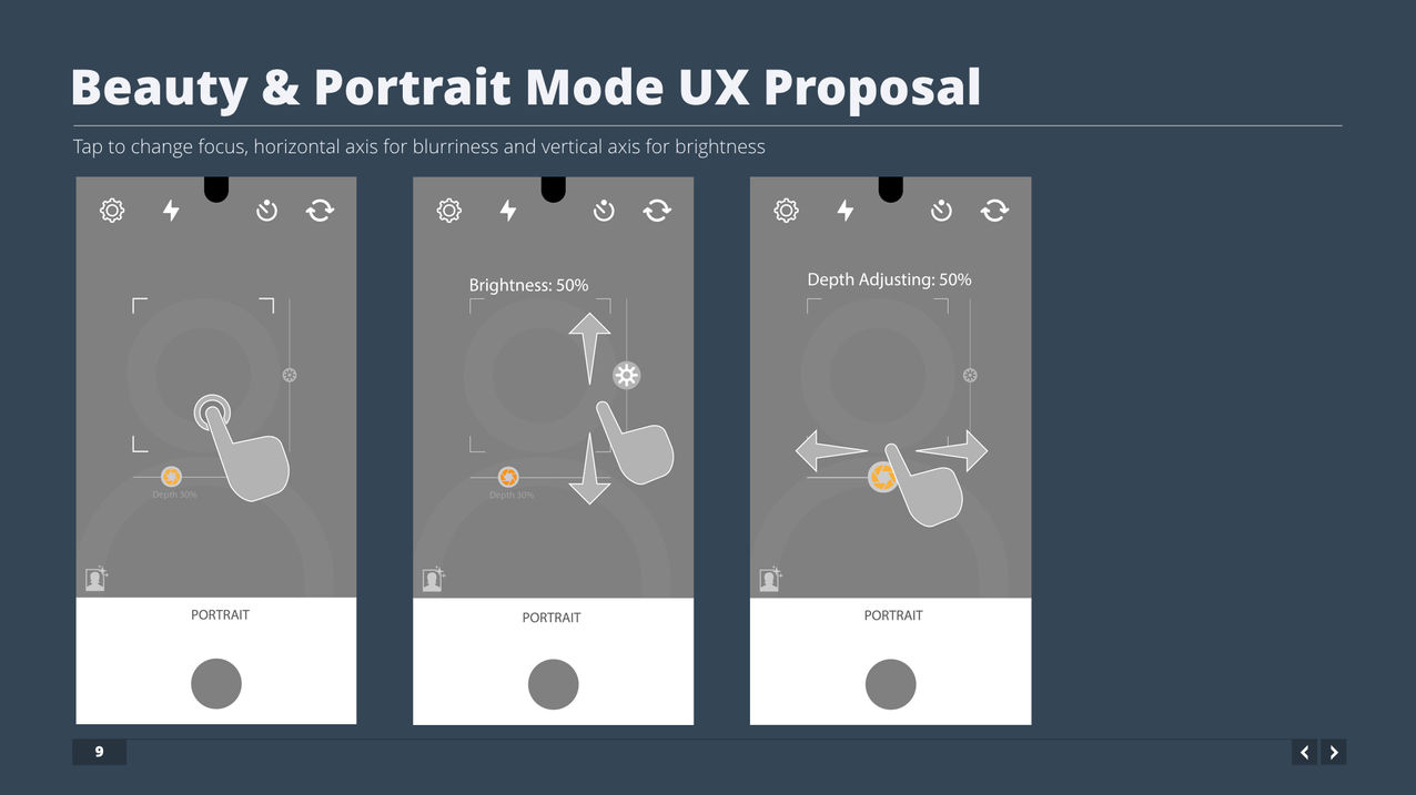 As an example, during the R&D process of the portrait mode feature, I proposed a few UX design patterns that are unique to the second generation of Essential. The portrait mode automatically identifies faces and portraits. Then it would apply effects like background blurriness to the portraits so they would look more vivid.